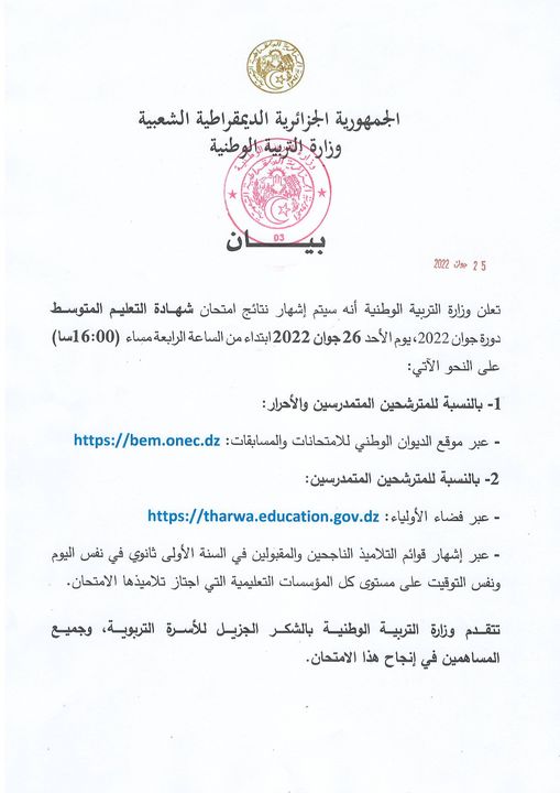 بيان حول إعلان نتائج إمتحان شهادة التعليم المتوسط دورة 2022