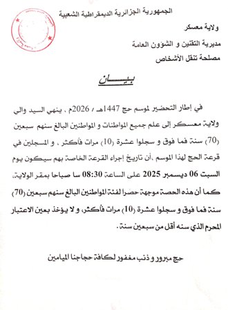 في إطار المتابعة الدورية لمختلف المشاريع التنموية الكبرى عبر إقليم الولاية، ترأس السيد عايسي_فؤاد والي ولاية معسكر، مساء اليوم الأحد 30 نوفمبر 2025، اجتماعًا تنسيقيًا خُصّص لمتابعة وضعية المشروع الاستراتيجي لإنجاز الشطر الثاني من الطريق المزدوج، المنفذ نحو الطريق السيار شرق–غرب، على مسافة 18 كلم.