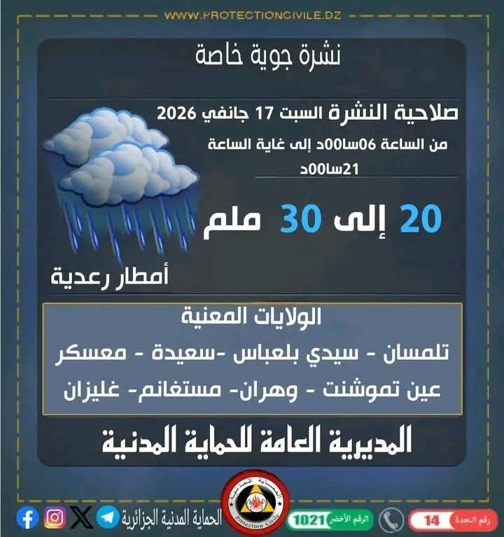 ? تبعا للنشرية الجوية الخاصة الصادرة عن الديوان الوطني للأرصاد الجوية تخص أمطار رعدية ? كميتها 20 ملم إلى 30 ملم يوم السبت 2026.01.17 على الساعة 06سا00د إلى غاية الساعة 21سا00د، تميز الولايات الآتية : #تلمسان، #سيدي_بلعباس، #سعيدة، #معسكر، #عين_تموشنت، #وهران، #مستغانم، #غليزان.