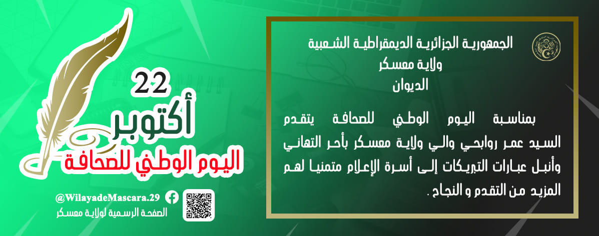 إحياء اليوم الوطني للصحافة المصادف ل 22 أكتوبر من كل سنة، أشرف والي معسكر السيد روابحي_عمر نهار اليوم على حفل أقيم بالمناسبة على شرف أسرة الإعلام بالولاية بمعية السادة رئيس المجلس الشعبي الولائي، السلطات العسكرية و الامنية، نائب البرلمان ، أعضاء المجلس للاعلى للشباب، الامين العام للولاية، رئيس الديوان ، مديرة الإدارة المحلية الى جانب أعضاء الصحافة المكتوبة، المسموعة، السمعية البصرية و الإلكترونية المحلية .