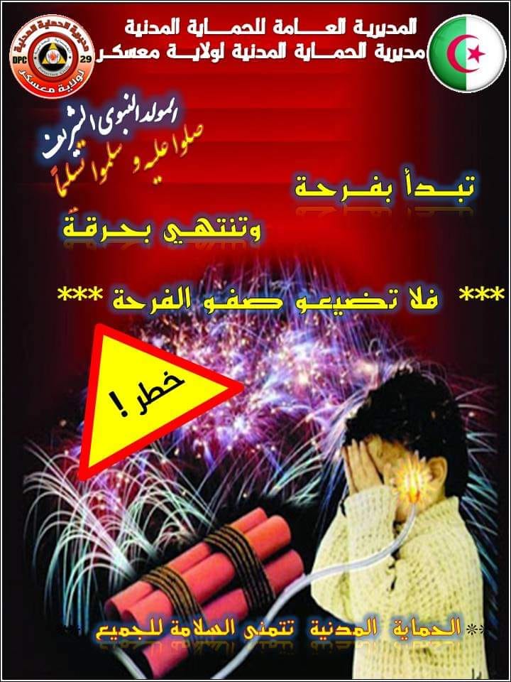 لهذا فإن مصالحنا تحذر من خطورة ظاهرة اطلاق أو استعمال الالعاب النارية والمفرقعات خلال الاحتفال بذكرى مولد سيد الخلق محمد صلى الله عليه وسلم تعبيرا