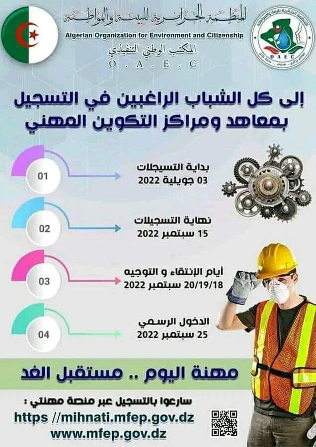 التسجيلات متواصلة الى غاية 15 سبتمبر 2022 على مستوى كافة معاهد و مراكز التكوين المهني لولاية معسكر.