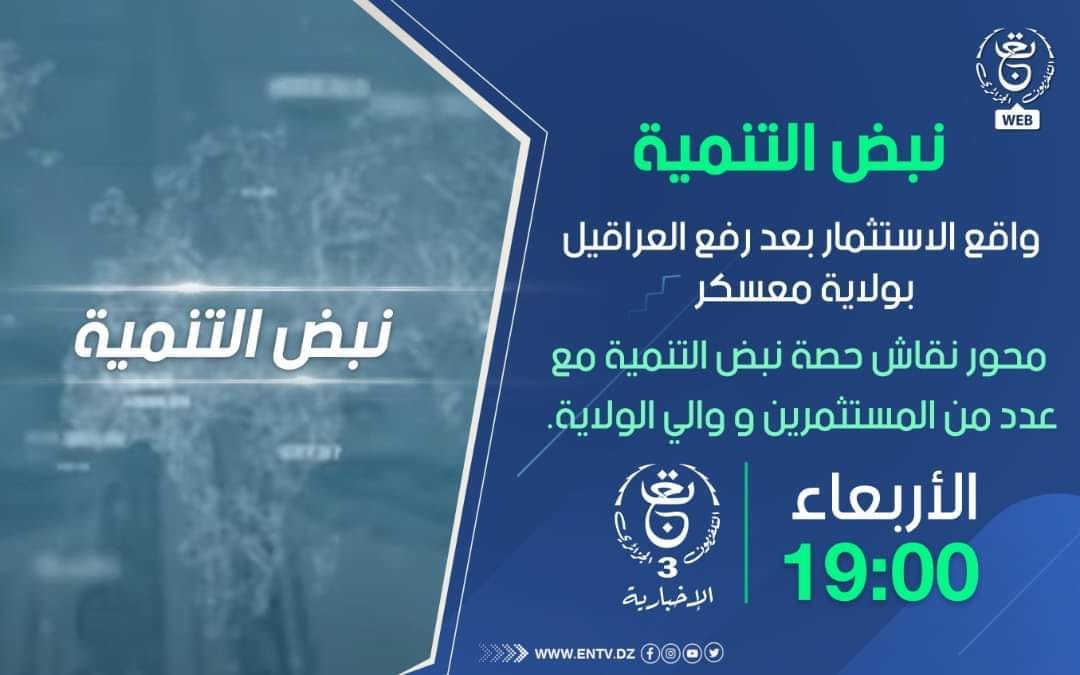 تبث هذا الاربعاء 23 نوفمبر 2022 على الساعة السابعة مساءا حصة نبض التنمية للتلفزيون الوطني القناة 03 الاخبارية التي تستظيف السيد الوالي و عدد من