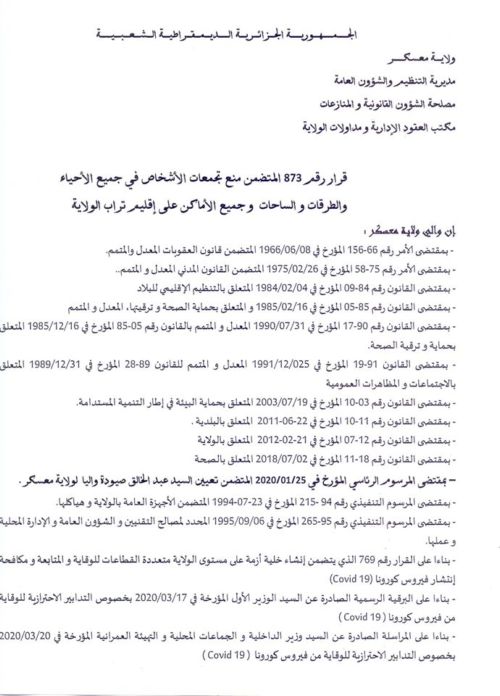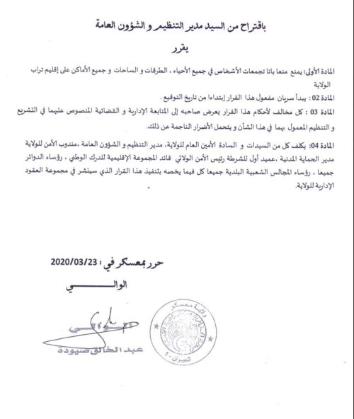 عملاً بتوجيهات السيد رئيس الجمهورية، أصدر السيد عبد العزيز جراد، الوزير الأول، تعليمة إلى الولاة والهيئات الـمعنية، ليذكرهم من خلالها بضرورة التطبيق الصارم للقواعد الـمتعلقة بالتدابير الـمتخذة في إطار الوقاية من كورونا فيروس ‘’كوفيد19 ’’ ومكافحته