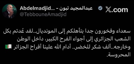 - رئيس الجمهورية يتمنى تأهل الخضر إلى المونديال قبل انطلاق المباراة أمام الصومال